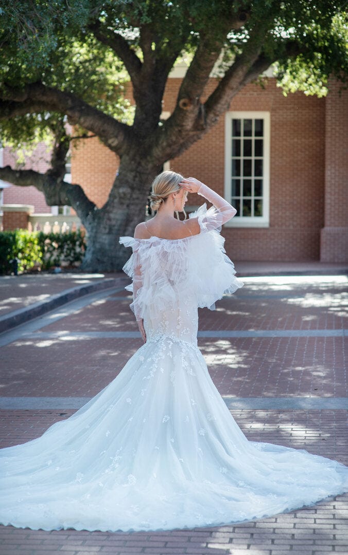 Experience the best of both worlds with our Two-Piece Mermaid Wedding Dress, featuring a stunning low-back mermaid gown and a dreamy tulle jacket with long sleeves. This dress offers you the flexibility of two distinct looks on your special day.