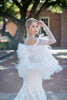 The mermaid wedding dress, with its low back design, accentuates your hourglass body shape, creating a captivating and alluring silhouette. For a twist of personality and added elegance, simply don the puffy tulle jacket with a straight neckline and long sleeves.